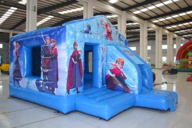 Our Disney Frozen Combo, 12 wide by 18 long and 6 foot slide, these style combos are very popular hires, this style combo is excellent if we get a couple of showers and wind, the kids are protected from the elements and the combo will stay dry.