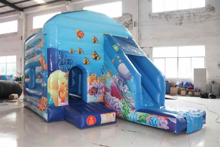 Our Under the Sea Combo, 12 wide by 21 long and 6 foot slide, this combos is a very popular hire, this combo is excellent if we get a couple of showers, the kids are protected from the elements and the combo will stay dry.